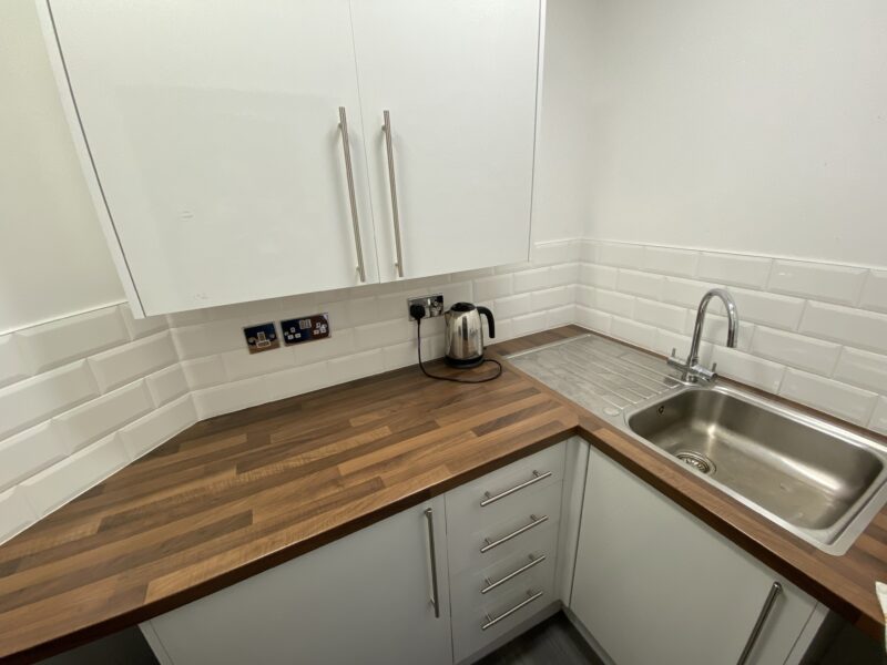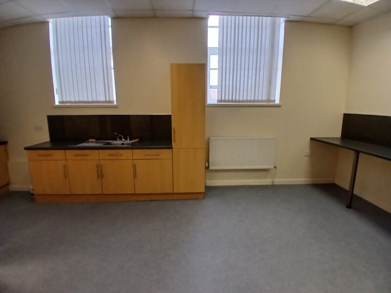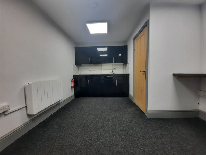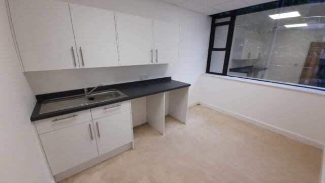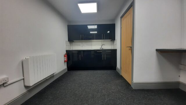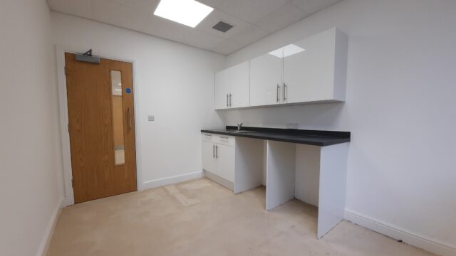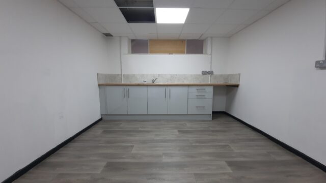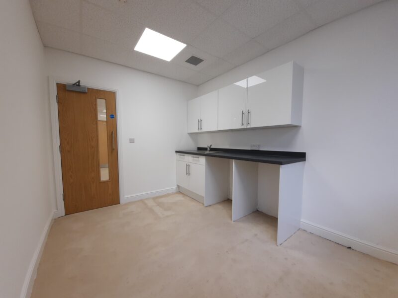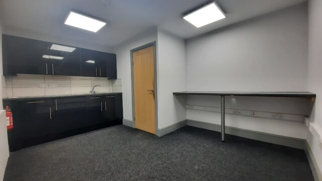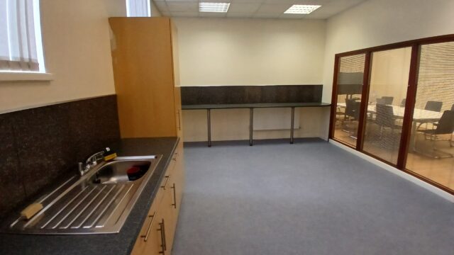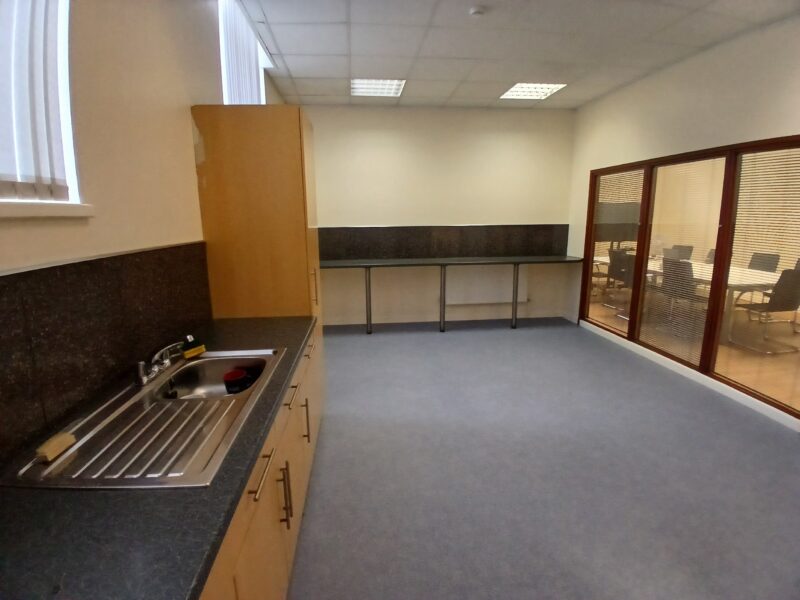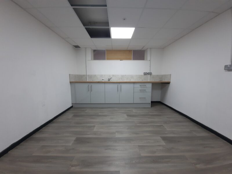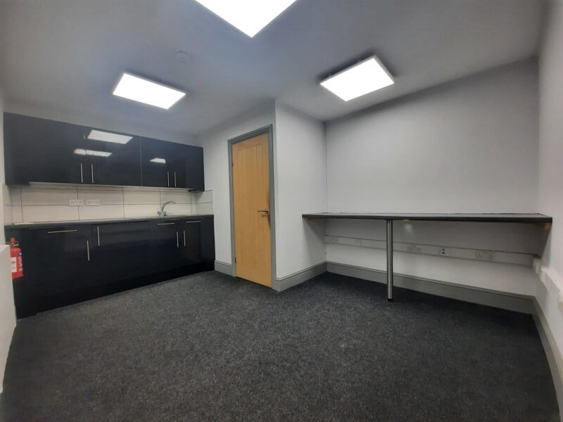- Modern office space featuring suspended ceilings, LED lighting and modern communal kitchenette and WC facilities.